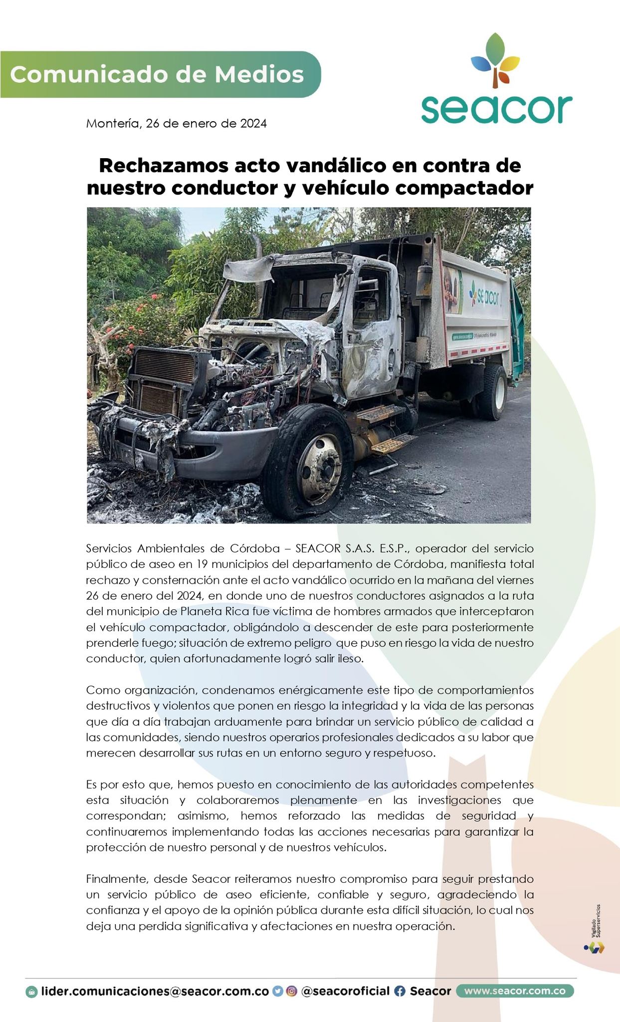 Servicios Ambientales de Córdoba – SEACOR S.A.S. E.S.P., operador del servicio público de aseo en 19 municipios del departamento de Córdoba, manifiesta total rechazo y consternación ante el acto vandálico ocurrido en la mañana del viernes 26 de enero del 2024, en donde uno de nuestros conductores asignados a la ruta del municipio de Planeta Rica fue víctima de hombres armados que interceptaron el vehículo compactador, obligándolo a descender de este para posteriormente prenderle fuego; situación de extremo peligro que puso en riesgo la vida de nuestro conductor, quien afortunadamente logró salir ileso.