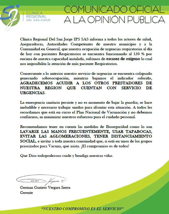 "Clínica Regional Del San Jorge IPS SAS informa a todos los actores de salud, Aseguradoras, Autoridades Competentes de nuestro municipio y a la Comunidad en General, que nuestra ocupación de urgencias respiratorias al día de hoy con pacientes Respiratorios se encuentra funcionando al 150 % por encima de nuestra capacidad instalada, sufrimos de escasez de oxígeno lo cual nos imposibilita la atención de más paciente Respiratorios".