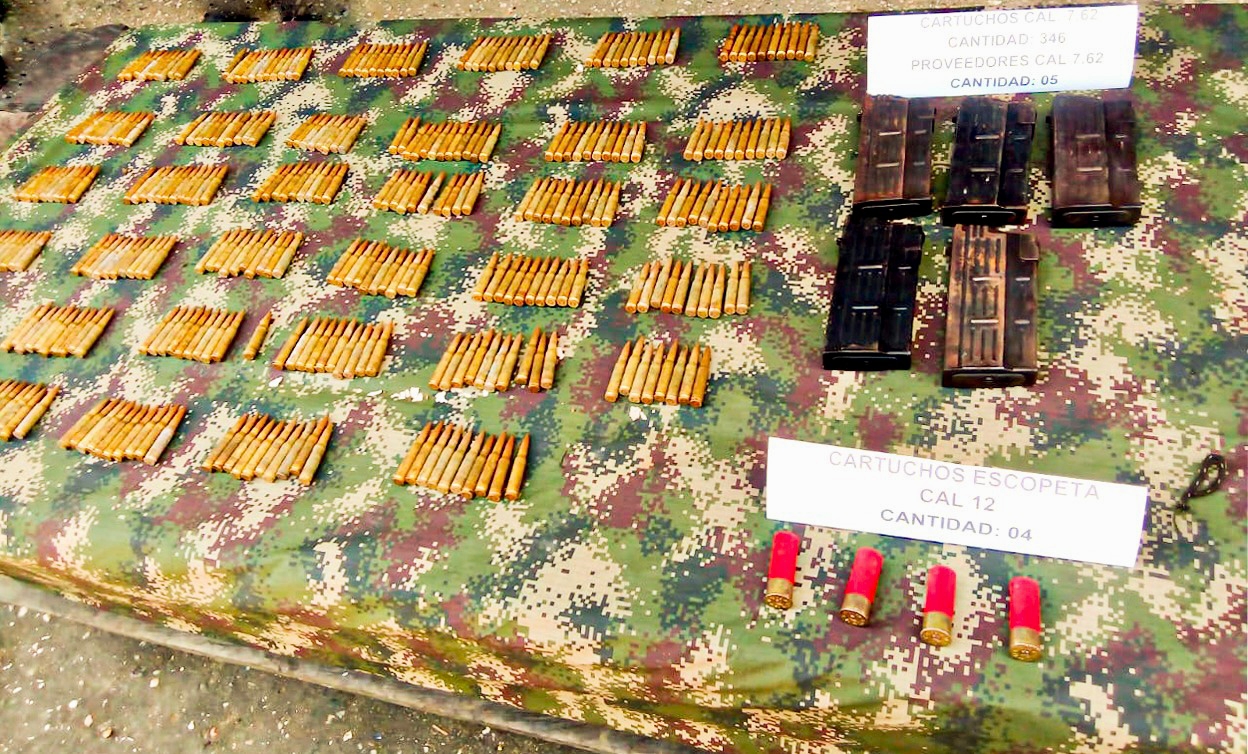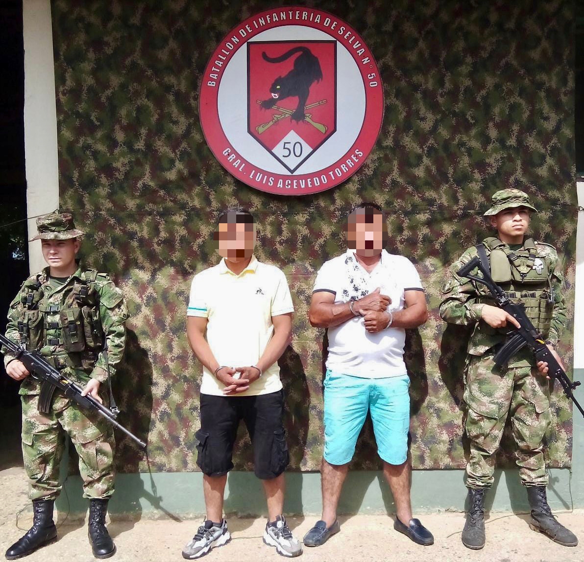 Nacional. Producto de operaciones militares conjuntas, coordinadas e interinstitucionales, adelantadas por tropas del Ejército Nacional, la Fuerza Aérea y la Policía, en el área no municipalizada La Pedrera, en el departamento de Amazonas, soldados del Batallón de Infantería de Selva N.° 50, capturaron en flagrancia a dos sujetos cuando transportaban 350 cartuchos de guerra y 209 kilos de marihuana.