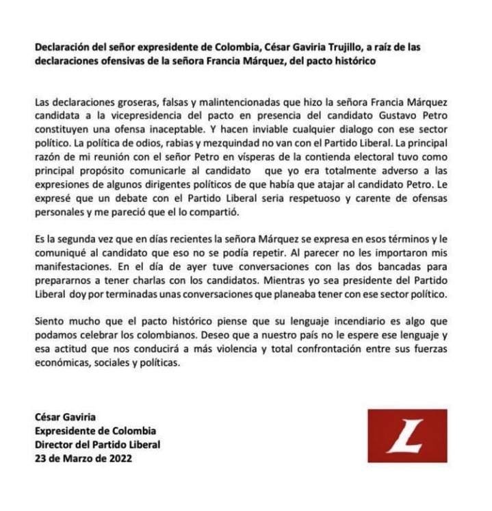 "Las declaraciones groseras, falsas y malintencionadas que hizo la señora Francia Márquez candidata a la vicepresidencia del pacto en presencia del candidato Gustavo Petro constituyen una ofensa inaceptable. Y hacen Inviable cualquier dialogo con ese sector político. La política de odios, rabias y mezquindad no van con el Partido Liberal. La principal razón de mi reunión con el señor Petro en vísperas de la contienda electoral tuvo como principal propósito comunicarle al candidato que yo era totalmente adverso a las expresiones de algunos dirigentes políticos de que había que atajar al candidato Petro. Le expresé que un debate con el Partido Liberal seria respetuoso y carente de ofensas personales y me pareció que el lo compartió.