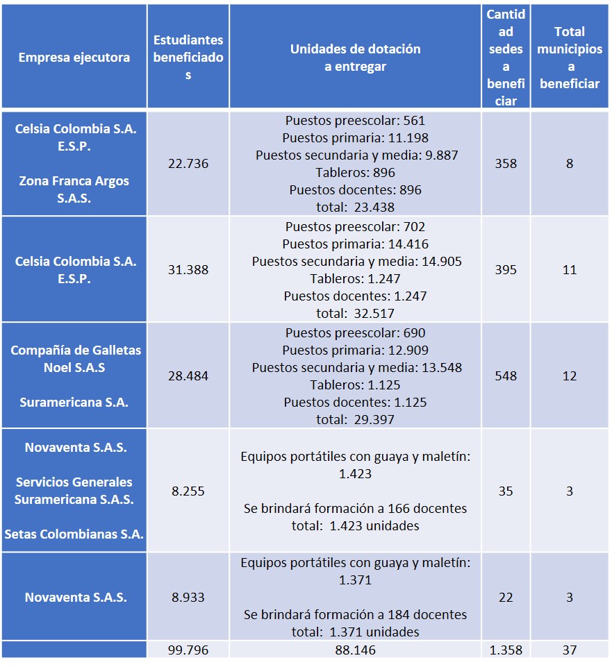 Con estos 5 nuevos proyectos serán entregadas 88.146 unidades de dotación correspondiente a puestos de estudio, escritorios para docentes, tableros, y equipos de cómputo portátiles que beneficiarán a 99.796 estudiantes de 1.358 sedes educativas de 32 municipios afectados por la violencia y la pobreza ZOMAC y 4 PDET. De igual manera, se brindará capacitación y formación en temas de informática y nuevas tecnologías a 350 docentes.