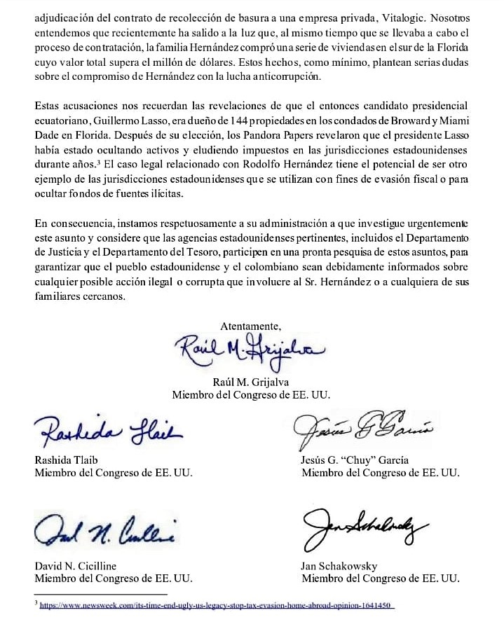El caso legal relacionado con Rodolfo Hernández tiene el potencial de ser otro ejemplo de las jurisdicciones estadpunidenses que se utilizan con fines de evasión fiscal o para ocultar fondos de fuentes ilícitas. En consecuencia, instamos respetuosamente a su administración a que investigue urgentemente este asunto y considere que las agencias estadounidenses pertinentes, incluidos el Departamento de Justicia y el Departamento del Tesoro, participen en una pronta pesquisa de estos asuntos, para garantizar que el pueblo estadounidense y el colombiano sean debidamente informados sobre cualquier posible acción ilegal o corrupta que involucre al Sr. Hernández o a cualquiera de sus familiares cercanos.