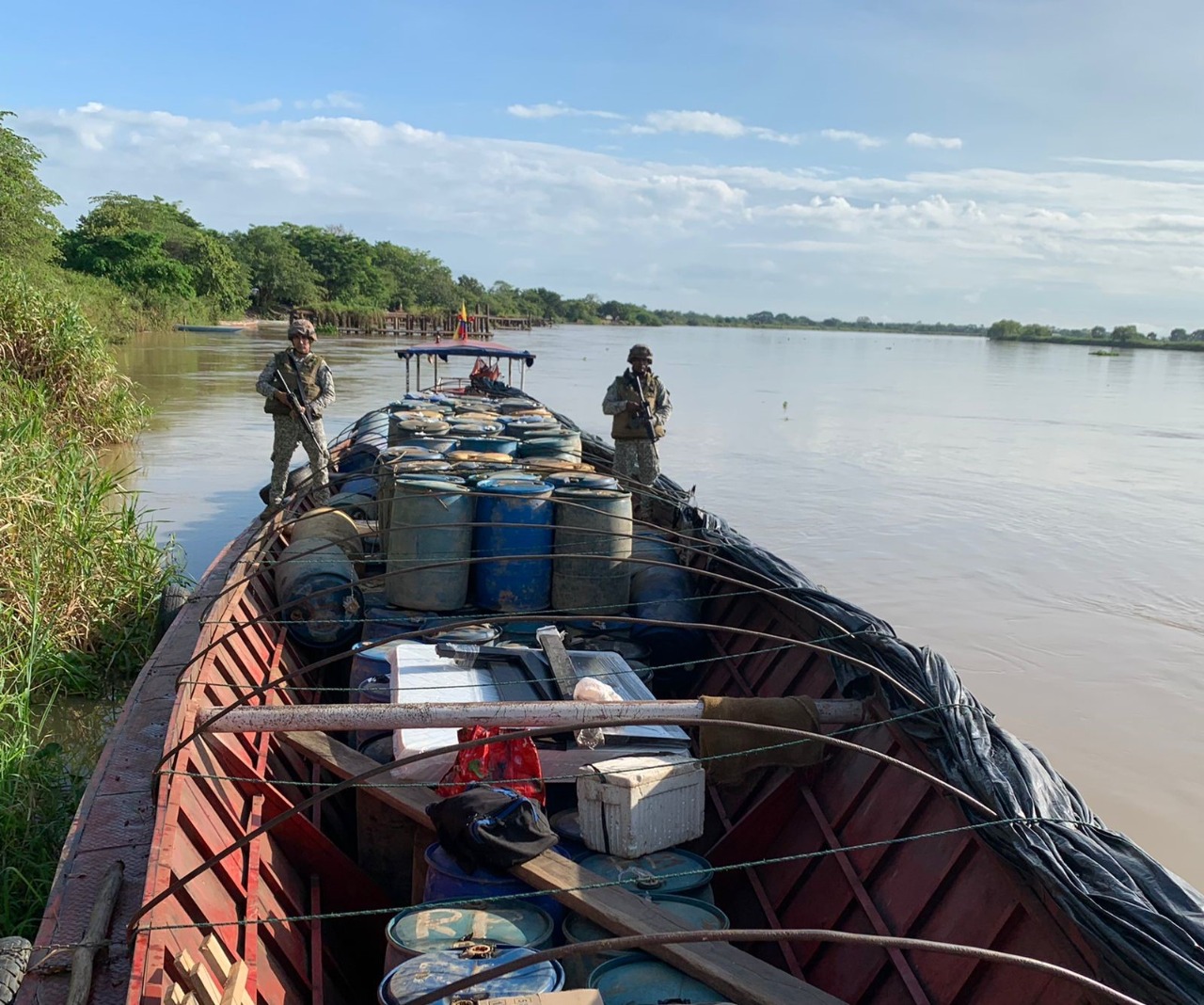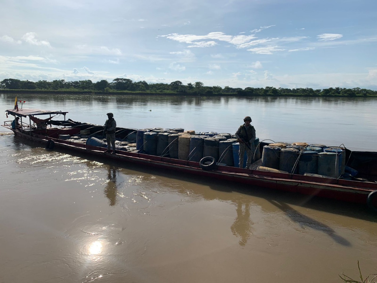 Horas más tarde, en el río Atrato, esta vez en el municipio de Quibdó, unidades de la Armada lograron incautar 3.100 galones de combustible que iban a bordo de una embarcación de madera sin contar con la documentación requerida para el transporte de este tipo de sustancias. Según información de inteligencia naval, este material pertenecería a la Subestructura “Héroes de Jesús Carretera” del Grupo Armado Organizado Clan del Golfo y sería utilizado para el procesamiento de base de coca.