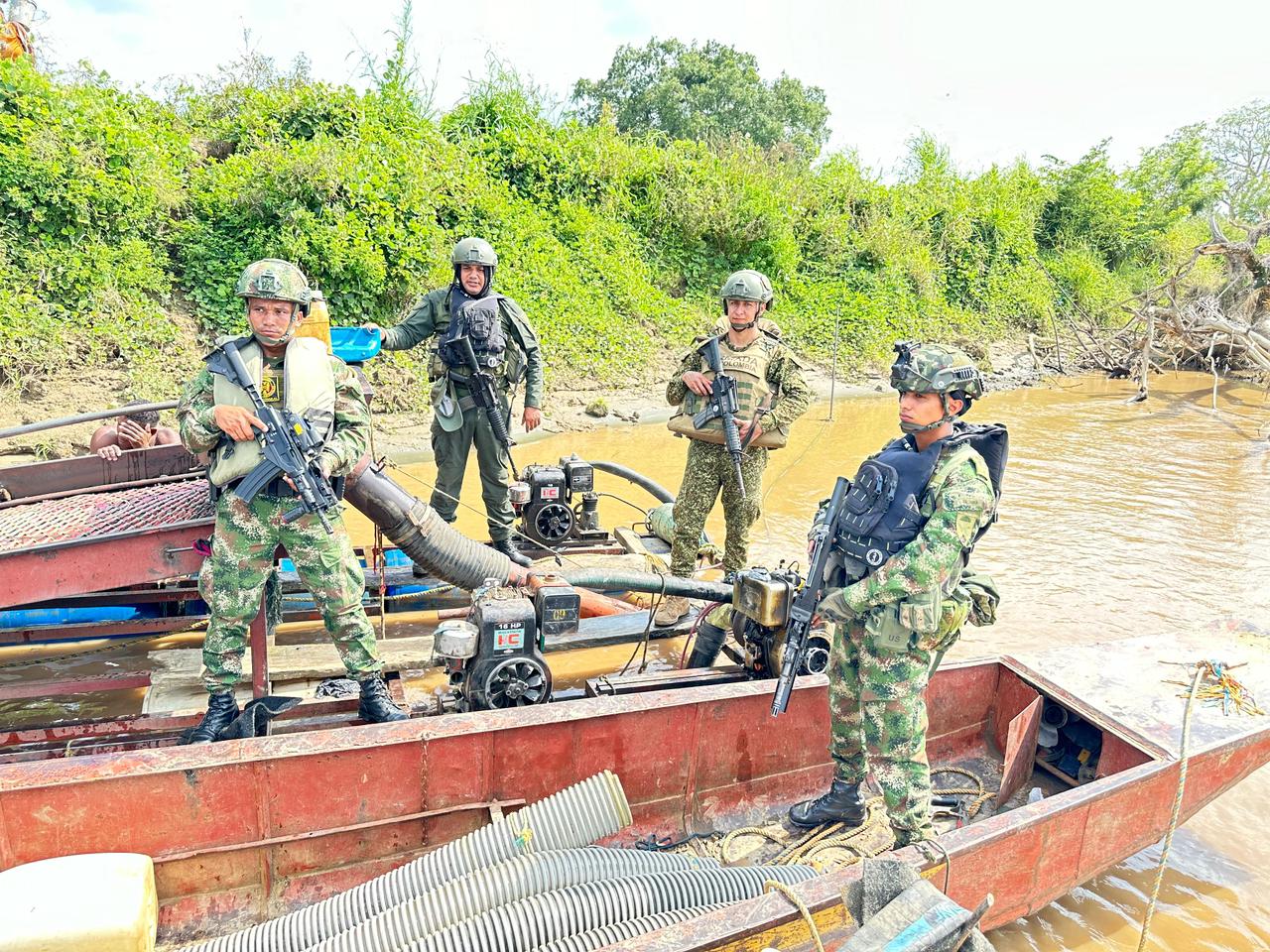 Antioquia. Según confirman las autoridades, buscando combatir las economías ilícitas que atentan contra el medio ambiente, soldados del Ejército Nacional, en una operación conjunta y coordinada con la Armada y la Policía, ubicaron e intervinieron en las últimas horas tres unidades de producción minera ilícita en la ribera del río Cauca, entre los municipios de Caucasia y Cáceres, en el departamento de Antioquia.